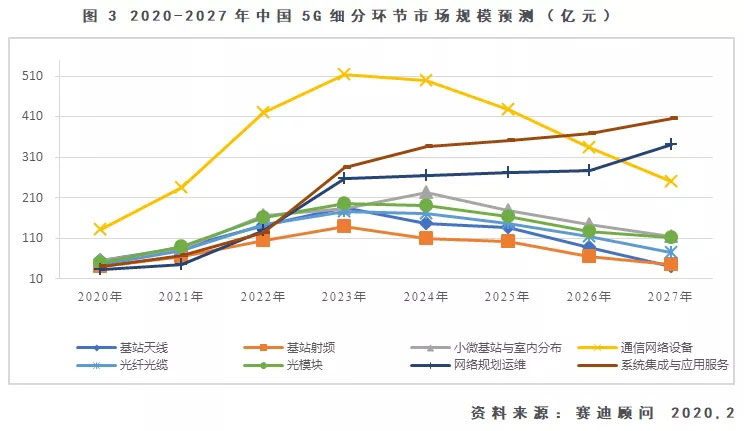 赛迪顾问总裁孙会峰认为:从产业推动要素来看,拉动5G产出增长的动力随着5G商用进程的深化而相继转换:在5G商用初期,运营商大规模开展网络建设,5G网络设备投资带来的设备制造商收入将成为5G直接经济产出的主要来源,预计2020年网络设备和终端设备收入合计约4500亿元,运营商在5G网络设备上的投资将超过2200亿元;5G商用持续推进,互联网企业与5G相关的信息服务收入增长显著,成为直接产出的主要来源,5G设备的支出将稳步增长,预计2030年互联网信息服务收入达到2.6万亿元,各领域在5G设备上的支出将超过5200亿元。
